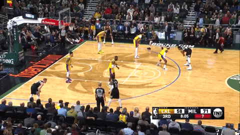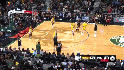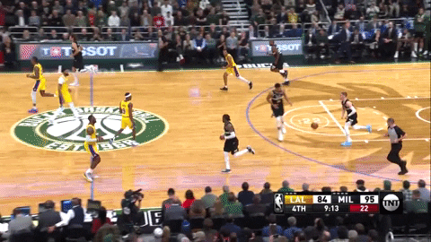 Finalmente, antes de hablar un poco de los Lakers, el actual MVP no solo hace proezas ofensivas, también es un engranaje muy funcional dentro de los esquemas defensivos que fomenta su equipo. Para la muestra la tapa a James después de un excelente trabajo de Mathews, Giannis logra quitarle el balón a James en un tiro de costado al aro. Observen bien como Mathews logra evadir muy bien la pantalla de McGee dejando a James lo suficientemente incomodo en el tiro siguiente y Giannis muy bien ubicado sale premiado con la tapa.