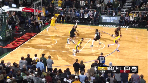 Continuaremos hablando de Giannis y su noche estelar. Noten en el siguiente clip como Caldwell-Pope logra quitarle el tiro a Giannis que inmediatamente reconoce el desbalance en estaturas y ataca el aro. Los Lakers ajustan adecuadamente colapsando la pintura hacia él y lo obligan a retirarse. Antetokounmpo lee la jugada y regresa a la línea de tres encestando un triple sobre Caldwell-Pope que poco podía hacer ante el tiro. Muestras de un gran jugador lograr ajustarse a los cambios defensivos y buscar soluciones rápidas como lo hizo Giannis acá