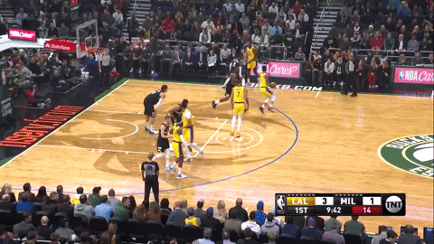 Esta jugada fue al final del partido con los Lakers intentando una remontada final. Se puede ver claramente el desajuste que generó AD en el tiro de Antetokounmpo y aquí vemos una jugada que Los Ángeles ha corrido desde octubre el pase largo de LeBron para un Anthony Davis que despega en velocidad hacia el otro aro, jugada que han ejecutado una y otra vez contra todos los equipos que se han enfrentado con el mismo resultado, canastas faciles para Davis